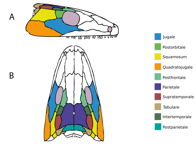 Das war nicht immer so. Die ersten Tetrapoden hatten, bis auf wenige Ausnahmen, keine Öffnungen in ihrer Schläfe. Ihre Schläfe war stattdessen von einem zusammenhängenden Panzer aus Hautknochen bedeckt (Abb. 1). Das erklärt auch, warum manche WissenschaftlerInnen die Gesamtgruppe der Tetrapoden samt dieser Urformen als Stegocephali („Dachschädler“) bezeichnen.4
