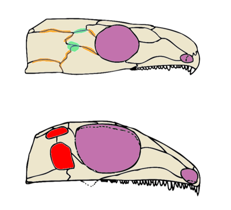 Eine ähnliche Hypothese hatte Fox (1964) für den bereits erwähnten Captorhinus aufgestellt.17 Demnach soll sich in der „Wange“ von Captorhinus, am Treffpunkt der Knochen Jugale, Squamosum und Postorbitale (vgl. Abb. 1 und 4) eine dünne Stelle befinden, die eine „Vorstufe“ einer Schläfenöffnung sein könnte. Das haben wir uns in einem Paper näher angesehen, aber mehr dazu in Teil 3.