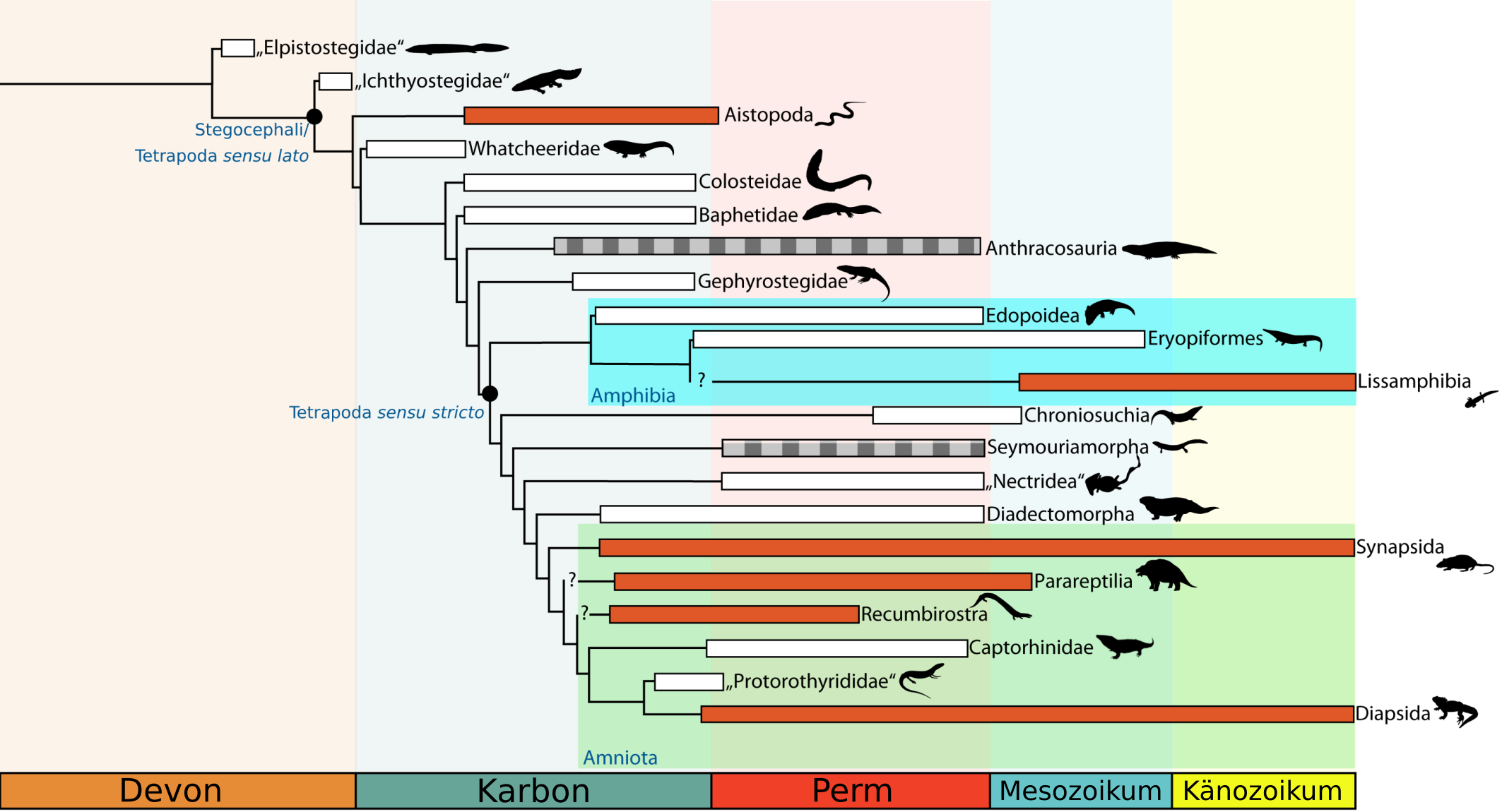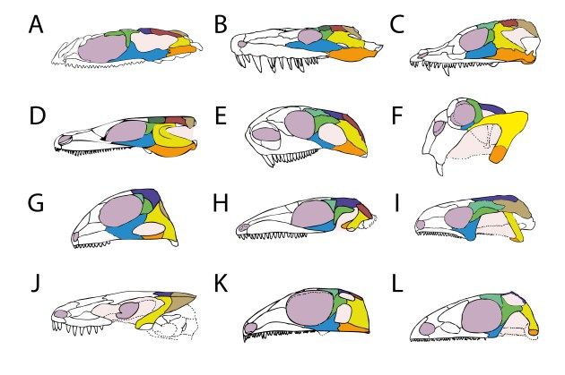 Aus Abel & Werneburg (2024). Schädelzeichnungen (A-L) nach Pardo et al. (2017), Panchen (1977), Reisz et al. (2009), Klembara et al. (2007), Romer & Price (1940), Ray (2005), Broom (1913), Gow (1972), Bolt & Rieppel (2009), Pardo et al. (2016), Reisz (1977), Carroll (1981).