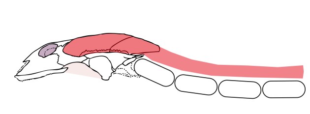 Frühe im Wasser lebende Tetrapoden haben wie Fische ihre Nahrung wohl „aufgesaugt“. Heißt, durch schnelle Kieferbewegungen wird ein Unterdruck erzeugt, der die Nahrung in das Maul befördert, wobei insbesondere die inneren Kieferadduktoren eine größere Rolle spielen. Das ist an Land nicht mehr möglich. Hier haben sich, vielleicht auch durch andere Anpassungen wie einem beweglichen Kopfgelenk,20 komplexere Kieferbewegungen entwickelt, die vor allem eine Vergrößerung der äußeren Kieferadduktoren (vgl. Abb. 3) benötigten.13