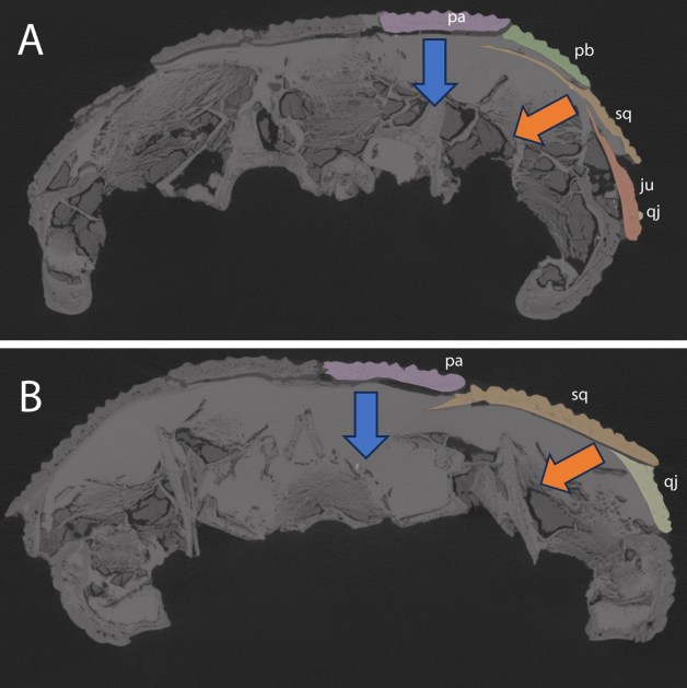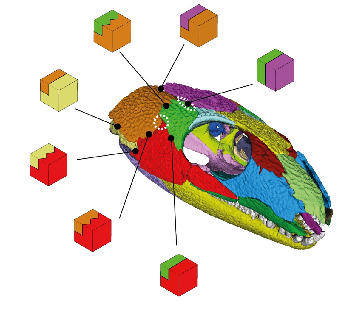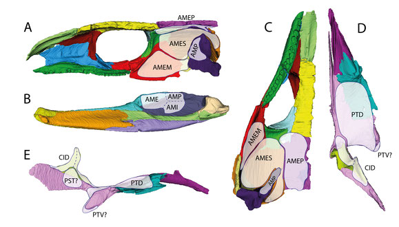 Insgesamt fällt eine „Verschachtelung“ der Schläfenknochen auf, die die gesamte Region wohl stabiler gemacht hat. Das Schuppenbein (braun) überlappt Quadratojugale (hellgelb) und Jochbein (rot). Wird aber selbst von Scheitelbein (violett) und Postorbitale (grün) überlagert.
