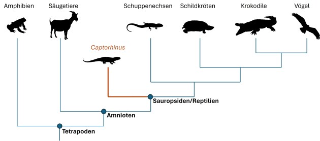 Ein zweiter Erkenntnisweg könnte hier über die nächsten lebenden Verwandten sein. Bei Captorhinus sind das aufgrund seiner basalen Stellung die Gesamtheit der heutigen Reptilien einschließlich der Vögel (Abb. 4). Problem nur, heutige Reptilien sind entgegen ihrem Ruf nicht „urtümlich“ und haben je nach Gruppe ihre Schädelanatomie deutlich verändert. Man müsste also über die Gemeinsamkeiten der verschiedenen Gruppen versuchen den Urzustand ihres letzten gemeinsamen Vorfahren zu rekonstruieren.