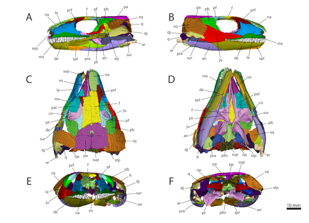 Titelbild: 3D Modell des Schädels von Captorhinus aguti, einem urtümlichen Reptil aus dem Perm der USA. Finden sich in ihm mögliche Vorstufen für Schläfenöffnungen? Aus Abel et al. (2022).