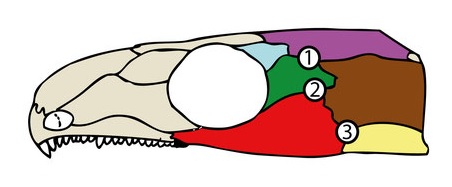 Ähnlich verhält es sich mit der Schwachstelle in der Wange (2 in Abb. 7). Einige frühe Synapsiden wie Dimetrodon (Abb. 2C im ersten Teil) hatten wie hier eine Öffnung exakt zwischen Jochbein, Schuppenbein und Postorbitale. Das dürfte allerdings auch daran liegen, dass diese Arten ihr Quadratojugale bereits deutlich zurückgebildet haben. Letzteres ist bei vielen anderen frühen Amnioten ebenfalls Teil der Umrandung. Manchmal erstreckt sich die Öffnung sogar bis zum Scheitelbein hoch.9