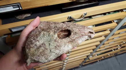 Diese Beobachtungen fanden auch wir spannend. In einem Paper wollten wir überprüfen, ob sich in einem Schädel ohne Schläfenöffnungen wirklich Schwachstellen nachweisen lassen und ob diese sich an den Stellen befinden, an denen andere Tiere Schläfenöffnungen entwickelt haben. Als Modellorganismus diente auch uns hierbei Captorhinus, genauer die Art Captorhinus aguti (Abb. 1). Wir haben uns für diese Tiere entschieden, da sie als frühe Amnioten relativ nahe anderen Arten mit Schläfenöffnungen standen und gleichzeitig durch eine große Zahl an dreidimensional erhaltenen Schädeln relativ gut belegt sind.