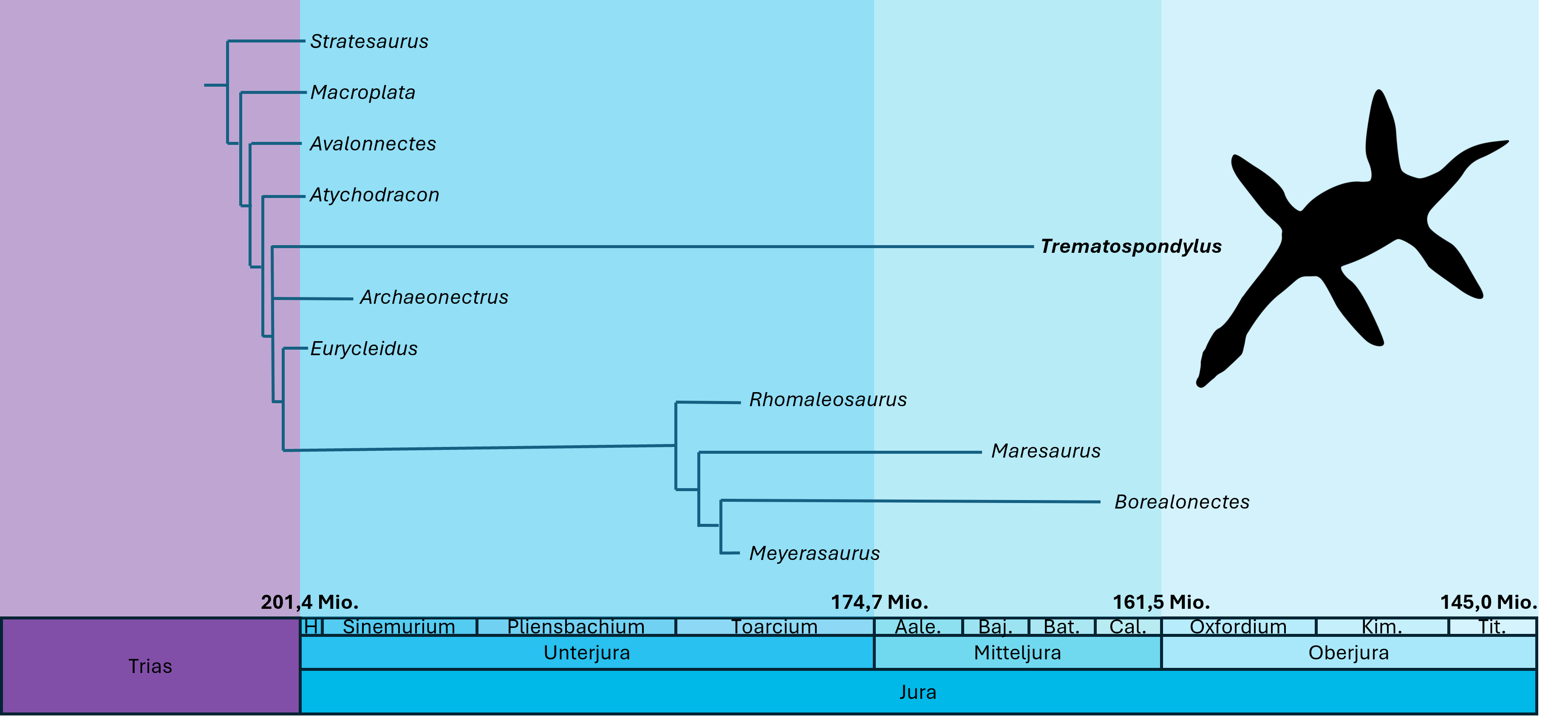 Spannend wird es dann allerdings bei der verwandtschaftlichen Stellung von Trematospondylus. Die Proportionen und Gestalt der Schwanzwirbel zeigen Ähnlichkeiten mit verschiedenen Vertretern der Rhomaleosauridae (Abb. 2), eine Familie oft recht großer Plesiosaurier, die zu ihrer Zeit zu den Top-Räubern der Meere gehörten. Es finden sich aber auch Gemeinsamkeiten mit Pliosauriden, ebenfalls Spitzenprädatoren mit einem kurzen Hals und großem Schädel und einigen Plesiosauroideen, die „typischen“ Plesiosaurier mit meist langem Hals und kleinem Schädel.