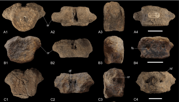 Unsere Studie war dann nach über 130 Jahren die erste, die sich detailiert mit den Fossilien auseinandergesetzt hat. Obwohl die Knochen stark erodiert sind, konnten wir einige neue Aussagen treffen. Wir konnten zeigen, dass die sieben Wirbelknochen wohl alle aus dem hinteren Teil der Wirbelsäule stammen. Zwei der Knochen sind eindeutig Schwanzwirbel, selbiges gilt wahrscheinlich für vier weitere Wirbel. Bei dem letzten Wirbel handelt es sich vermutlich um einen Kreuzwirbel, er lag also im Bereich der Hüfte.