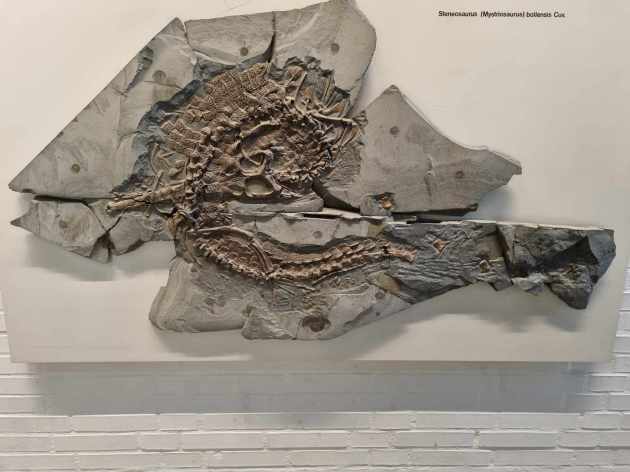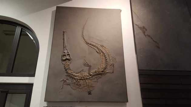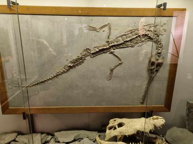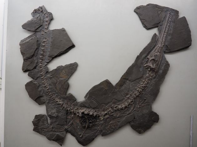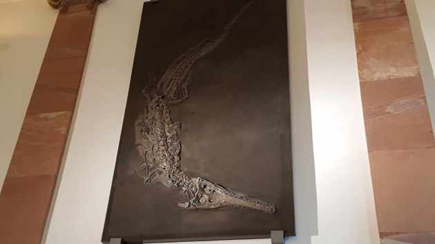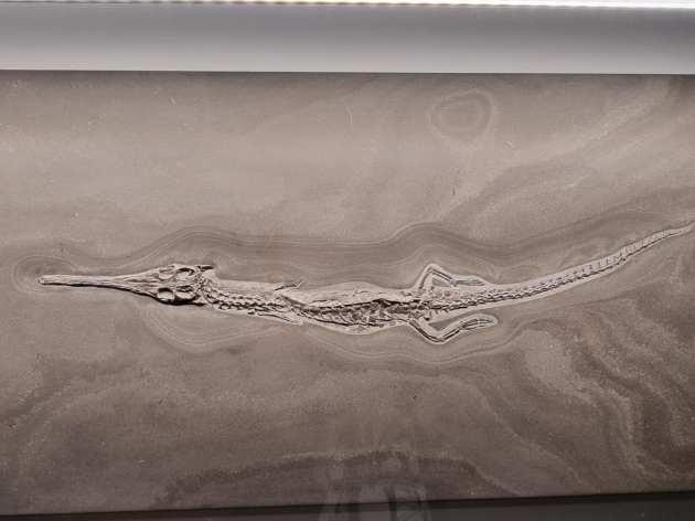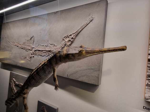 Titelbild: Lebendgroßes Modell des Meereskrokodils Macrospondylus bollensis im Urweltmuseum Hauff.