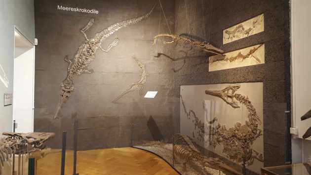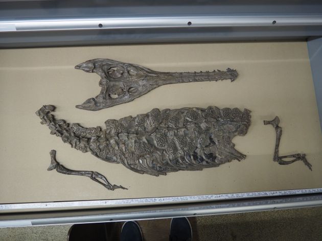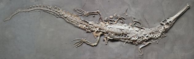 Ganz anders verhält es sich mit Pelagosaurus typus. Er ist die zweithäufigste Meereskrokodilart im Posidonienschiefer und im Gegensatz zu den drei bis jetzt genannten kein Mitglied der Teleosauroidea, sondern gehört stattdessen in die Metriorhynchoidea. Er war also ein Vorläufer der späteren Hochseeformen. Das sieht man auch bereits an seinem Körperbau. Nur leicht gepanzert, kurze Beine, nach vorn gerichtete Augen und vergrößerte Salzdrüsen zur Ausscheidung von überschüssigem Salz.17 Nichtdestotrotz dürfte Pelagosaurus ebenfalls weiterhin an Land gegangen sein.18 Seine Schnauze war lang mit grazilen Zähnen, seine Beutetiere entsprechend klein.16 Im Rumpf eines Exemplars wurden die Reste des kleinen Fischs Leptolepis gefunden.19