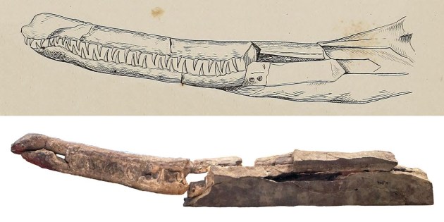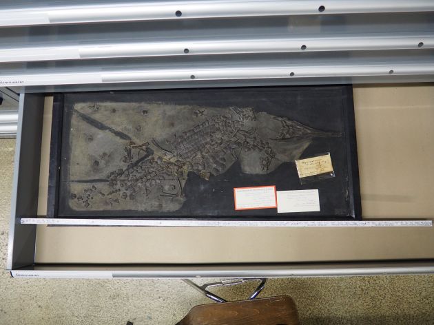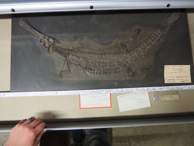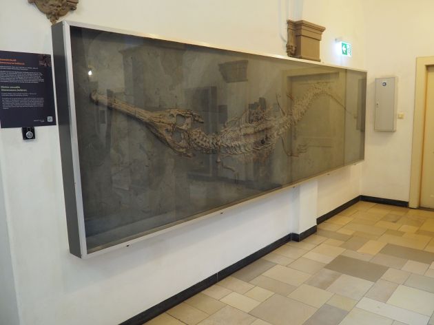 Das Exemplar besteht in erster Linie aus dem hinteren Rumpf und der Beckenregion. Auch ohne Schädel war den meisten damaligen Wissenschaftlern bereits klar, dass das Fossil zu einer Art Krokodil gehört haben muss. Georg Friedrich Jaeger (1785-1866) war im Jahr 1828 schließlich der erste, der darin eine bislang unbekannte Art erkannte und sie anhand ihres Fundorts Crocodilus bollensis taufte.2 Es ist zwar nicht das erste benannte Meereskrokodil, aber anhand des Fossils in Dresden das erste der Wissenschaft bekannt gewordene Mitglied der Thalattosuchia und eines der ersten ausgestorbenen Reptilien, das als solches erkannt wurde.
