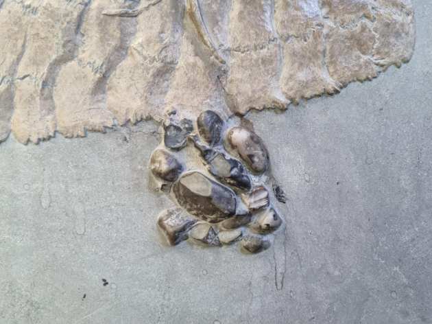 Ein interessanter Fund in diesem Zusammenhang sind außerdem quarzitische Kieselsteine von der Rumpfregion eines chimärischen Exemplars (Abb. 9). Die passen nicht in das ansonsten feine Sediment des Posidonienschiefers. Die Vermutung liegt nahe, dass es sich dabei um Magensteine handelt, die von dem Tier an der Küste oder in einem Fluss bewusst aufgenommen wurden.4 (siehe auch Hölder (1955), leider keine digitale Version auffindbar). Westphal (1962) vermutet, sie stammen vom Böhmisch-Vindelizischen Land, einer ehemaligen Hochlandinsel, die sich über Teile des späteren Alpenraums und des heutigen Tschechiens erstreckte. Auch Treibholz soll von Tieren aufgenommen worden sein.