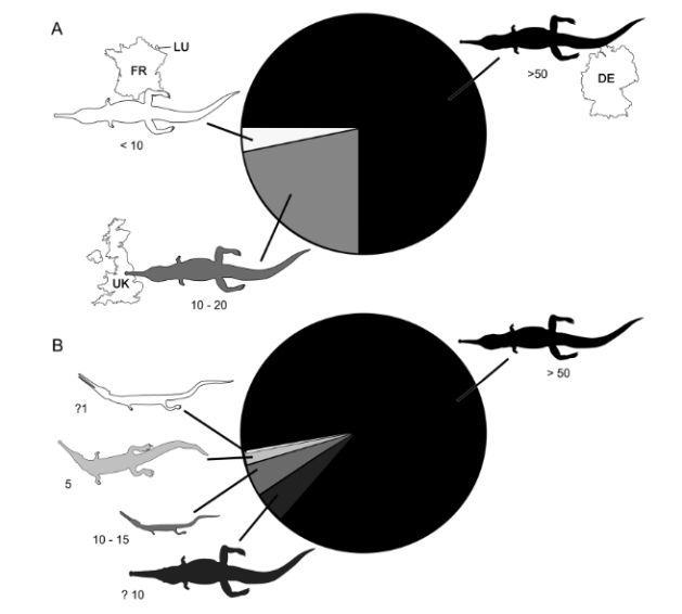 Zuletzt ist die geographische Verbreitung und relative Häufigkeit von Macrospondylus interessant (Abb. 11). Macrospondylus scheint das dominante Meereskrokodil im damaligen europäischen Meer gewesen zu sein. Warum das so war, ist schwer zu sagen. Wie bereits erwähnt, war Macrospondylus wahrscheinlich ein Generalist und hatte eine entsprechend hohe Toleranzschwelle was seine Umwelt anging. Die anderen Meereskrokodile waren eventuell weniger flexibel oder haben wie im Fall von Pelagosaurus und Plagiopthalmosuchus sogar direkt konkurriert. Allerdings darf man auch Verzerrungen durch eine unterschiedlich starke Sammeltätigkeit in den Regionen nicht ausschließen. Auch ob es vielleicht zeitliche Unterschiede bei der Verbreitung der fünf Arten gab, ist noch nicht gut untersucht.20