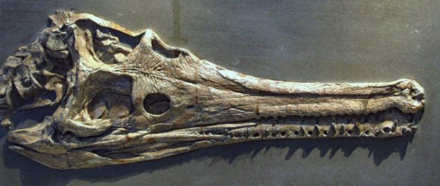 Gleichzeitig hat sich Steneosaurus immer mehr als „Mülleimergattung“ herausgestellt.4 Das bedeutet, dass viele Steneosaurus-Arten oberflächlich ähnlich aussehen, aber eigentlich gar nicht besonders miteinander verwandt waren. Man könnte sogar die Gültigkeit von Steneosaurus insgesamt anzweifeln, da sich die ersten bekannten Fossilien (siehe nochmal Abb. 4) nicht eindeutig von anderen Meereskrokodilen unterscheiden lassen.